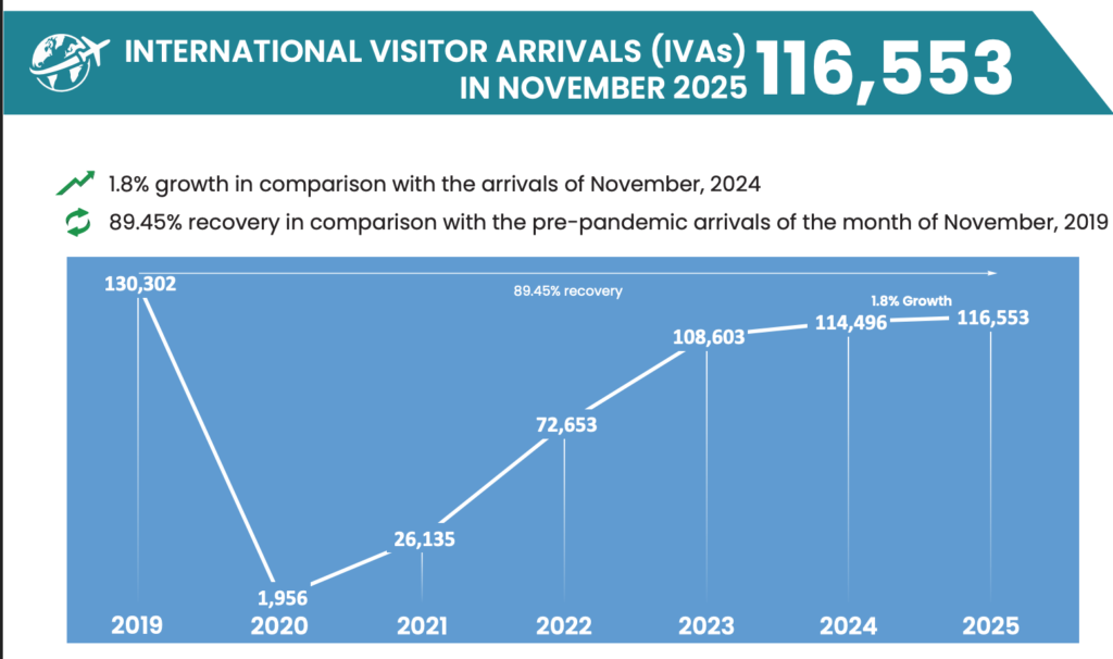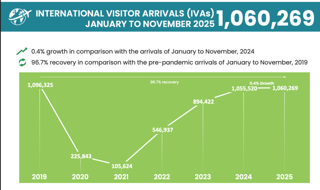 - October 2025 saw the highest monthly arrivals so far this year with 128,443 visitors, marking a 3.3% increase over October 2024 and near full recovery to pre-pandemic levels.