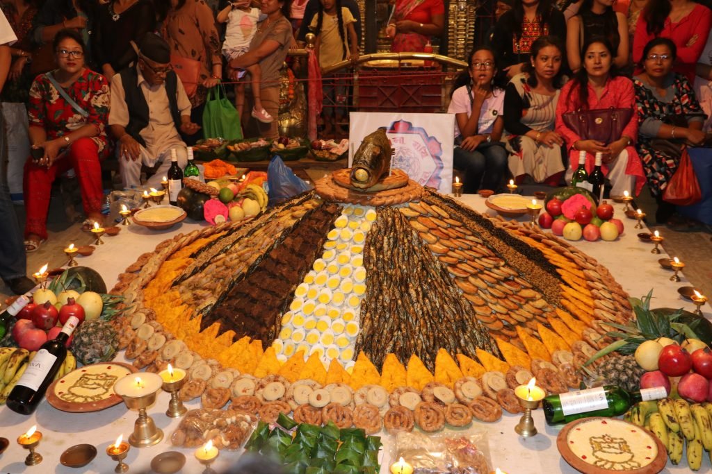 Lapate Bhoye is performed occasionally as the celebration of a wedding, Bratabanda. It is the traditional party of Newars where you will be seated on long, narrow straw mats, and foods are served in a sequential way on a lapate (leaf plate). The drinks are offered in a small clay bowl (pala/salicha). Elders are the first to be served then to others. The items include Baji (beaten rice) followed by curries like Geda-Gudi (mix of different lentils), Hariyo Saag (green spinach), and Alu tama (curry of potatoes and bamboo shoot) having a unique aroma, you surely can’t deny tasting. Spicy achaar (pickles) follow, and there may be two of those: Alu Kerau (a spicy mixture of radish, potatoes, and green and small brown peas) and Tamatar ko achaar (ripe tomato pickle). I being Newar, am a fan of SamayBaji and Lapate Bhoye.